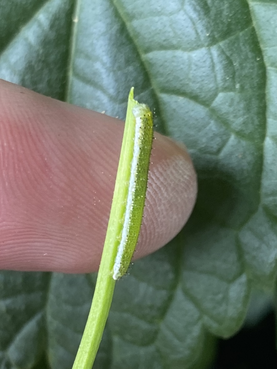My little plant bloomed, and I even saw an orangetip near it one day (though not on it). Today, I realized the blooms had completely fallen off, or seemed to be completely gone, and much to my surprise there was a tiny, green caterpillar hanging on to the end of the stem. Some quick searching confirmed there was a pretty good chance it's a Falcate orangetip caterpillar, and this little plant is doing exactly what we were hoping it would.