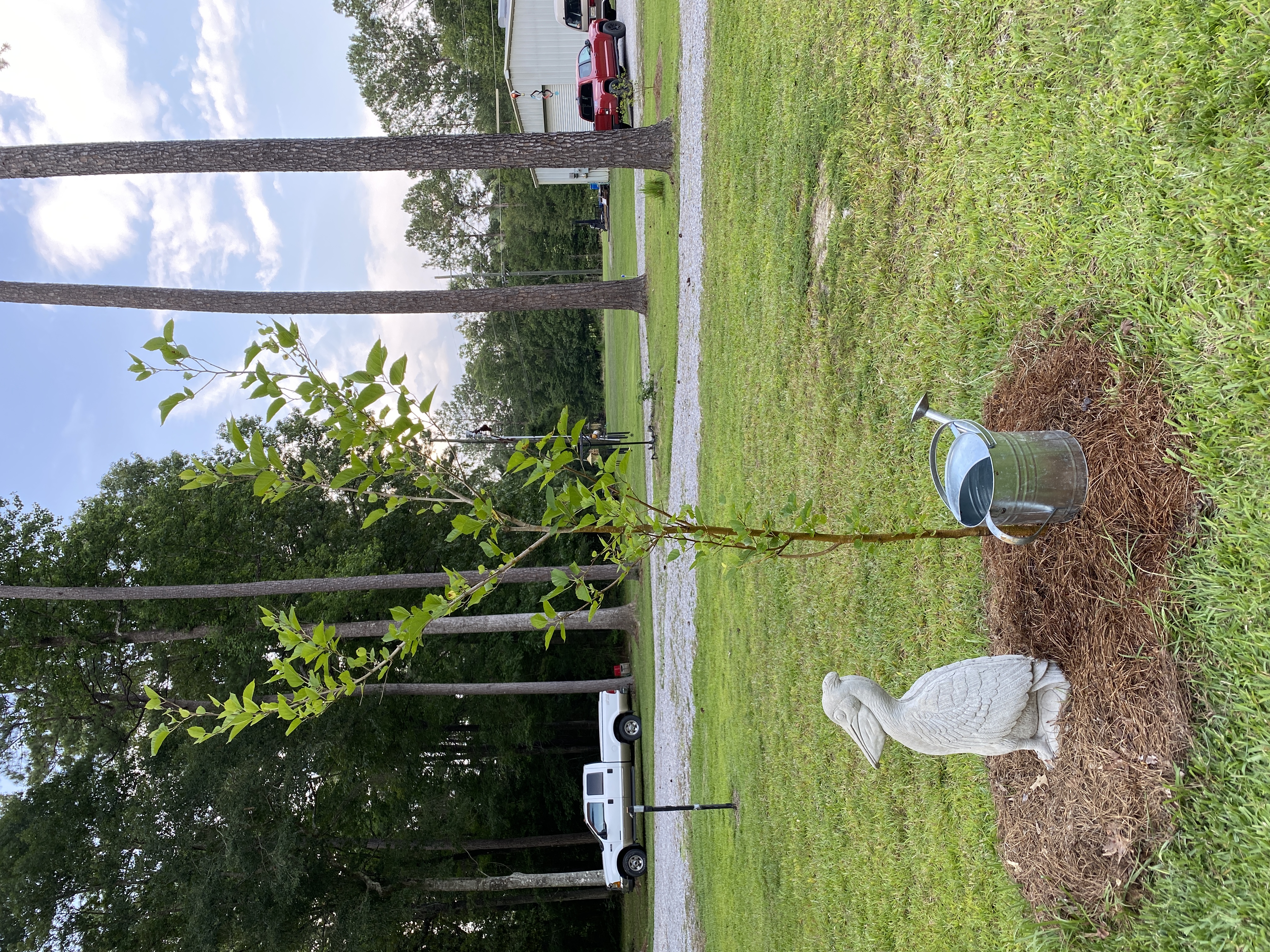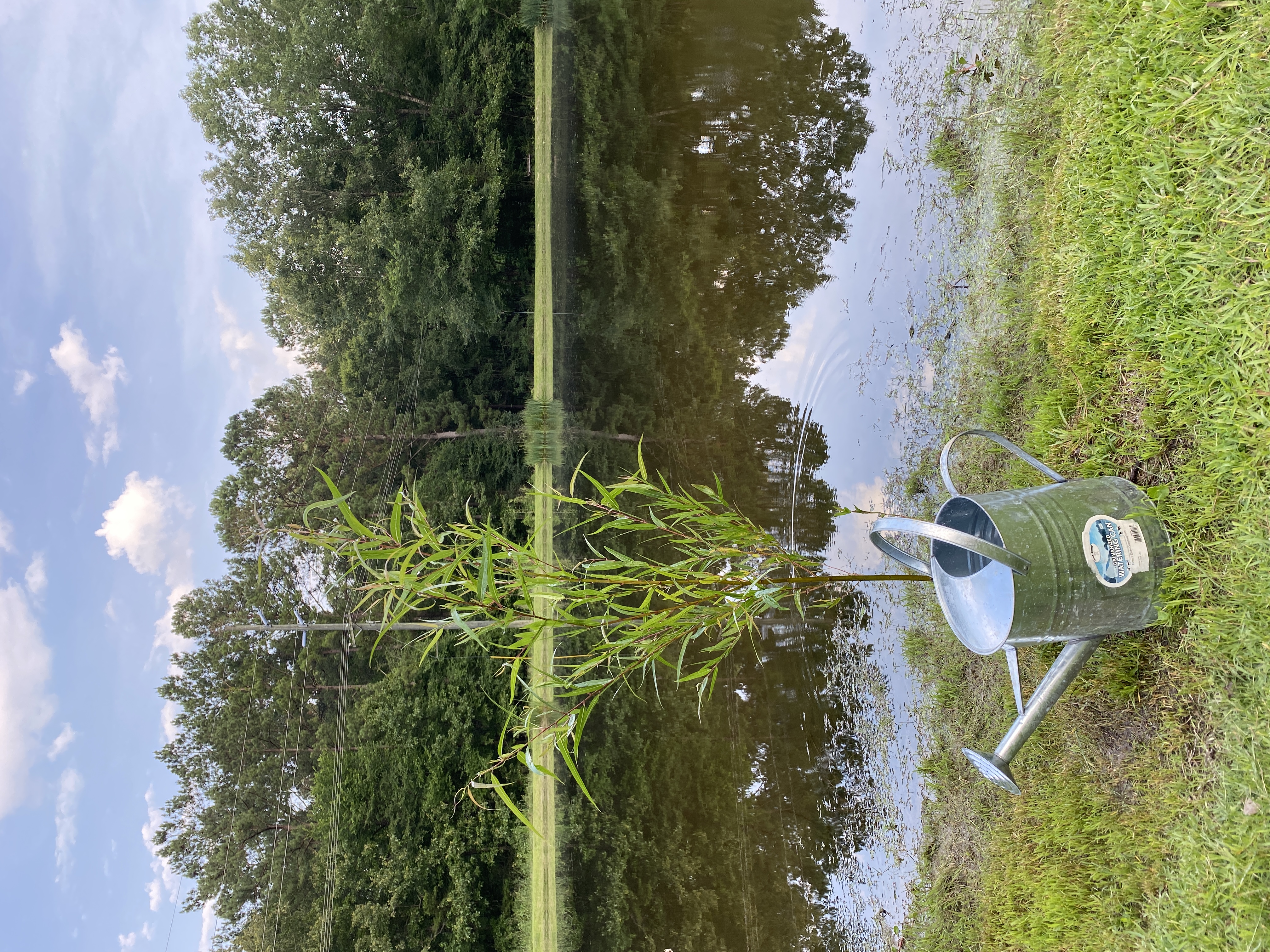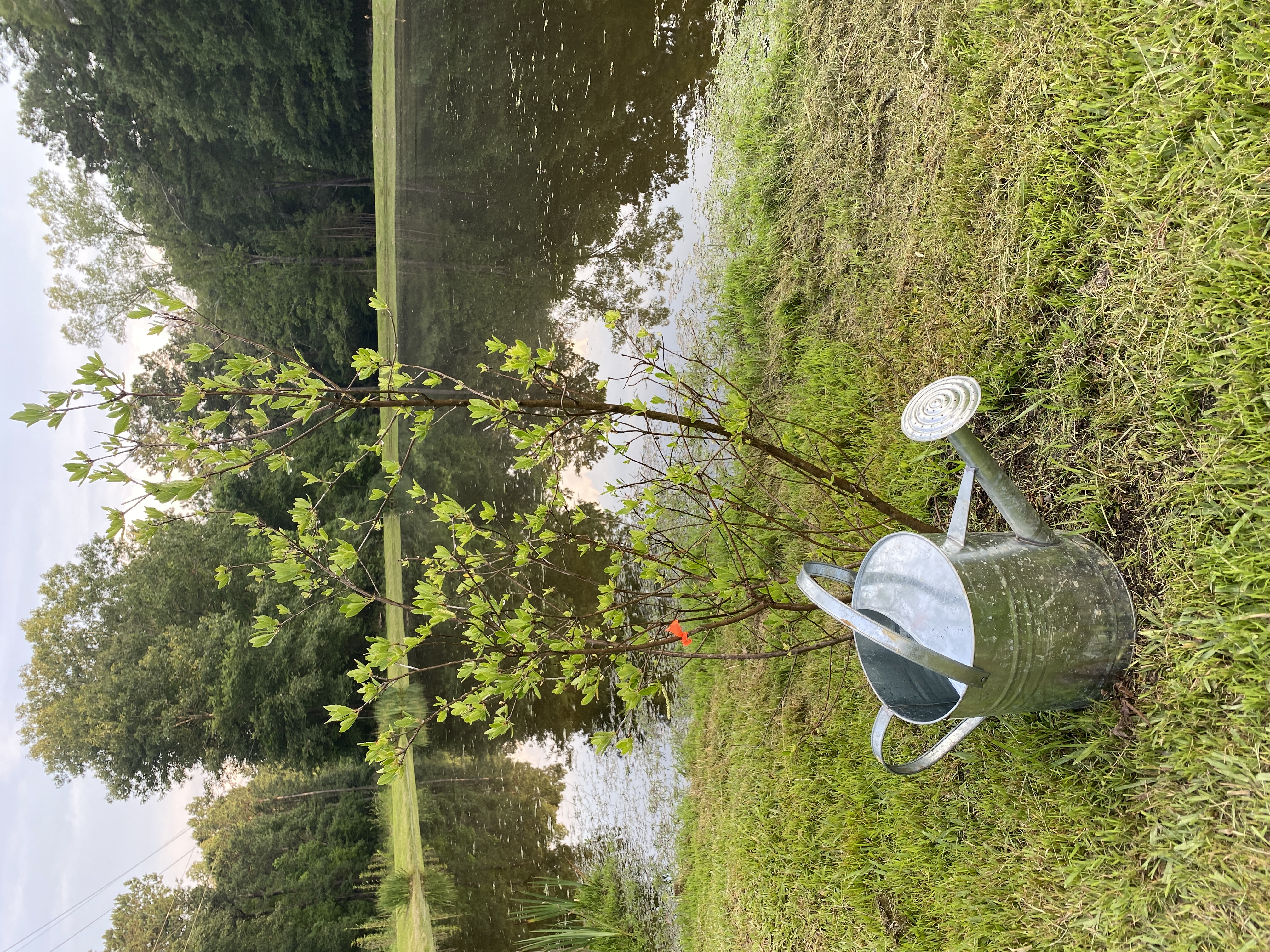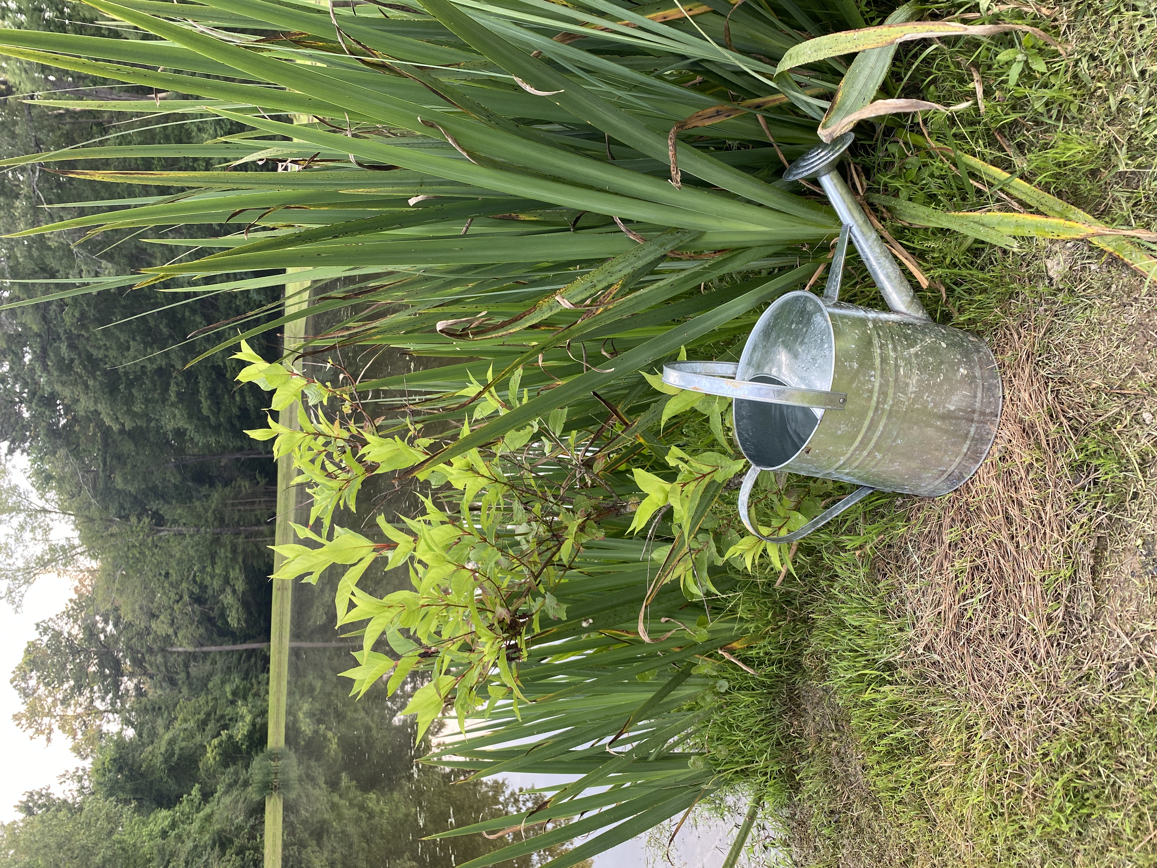 Titi 1 is a more upright plant, growing nearer to the existing Bald Cypress trees where a more upright, tree-like posture will suit it, I think. It also leaves room to add some more on either side if we find more water-loving plants! We really hope to fill in this Northeast corner of the pond nearest to us.