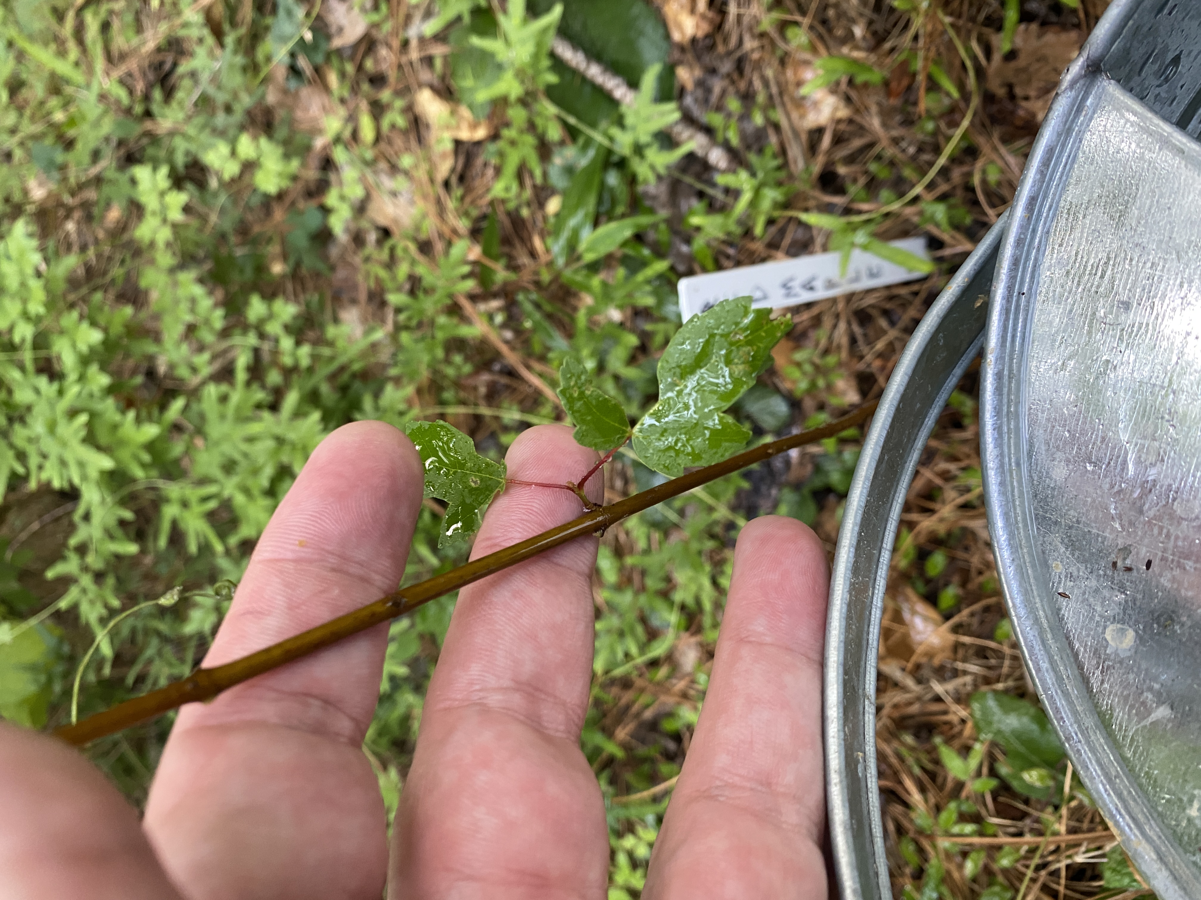 Pond Maple 2 is the only one that looks pretty good still, with mostly green leaves and even the newest growth holding on so far. Numbers 1 and 3 aren't doing so great. Number 1 was the largest volunteer by far, and is showing some new green growth since planting, which is encouraging even though it has mostly died back so far. Number 3 is just fried. I'm not sure if it's alive, honestly, but I didn't have a knife on me to scrape the bark and check. My mom has plenty more volunteers where that came from, though, so if it doesn't survive I can try again.