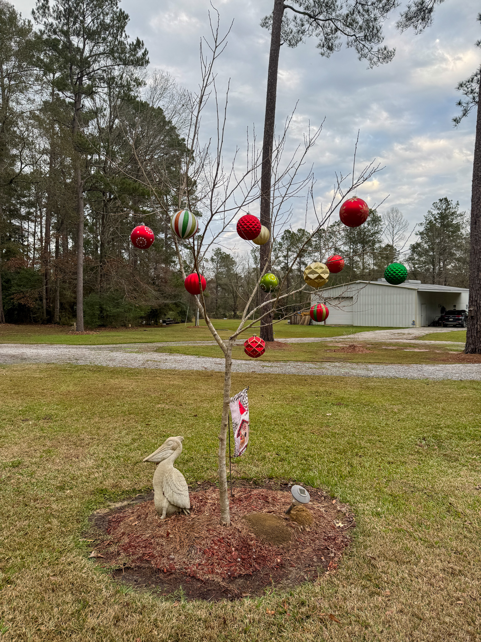Mulberry 2 and its decorations, doing well near the house. It looks like it's doing very well, and I assume it must be putting out some great leaves and fresh growth in its place, since it can be seen right from the kitchen window of the main house.