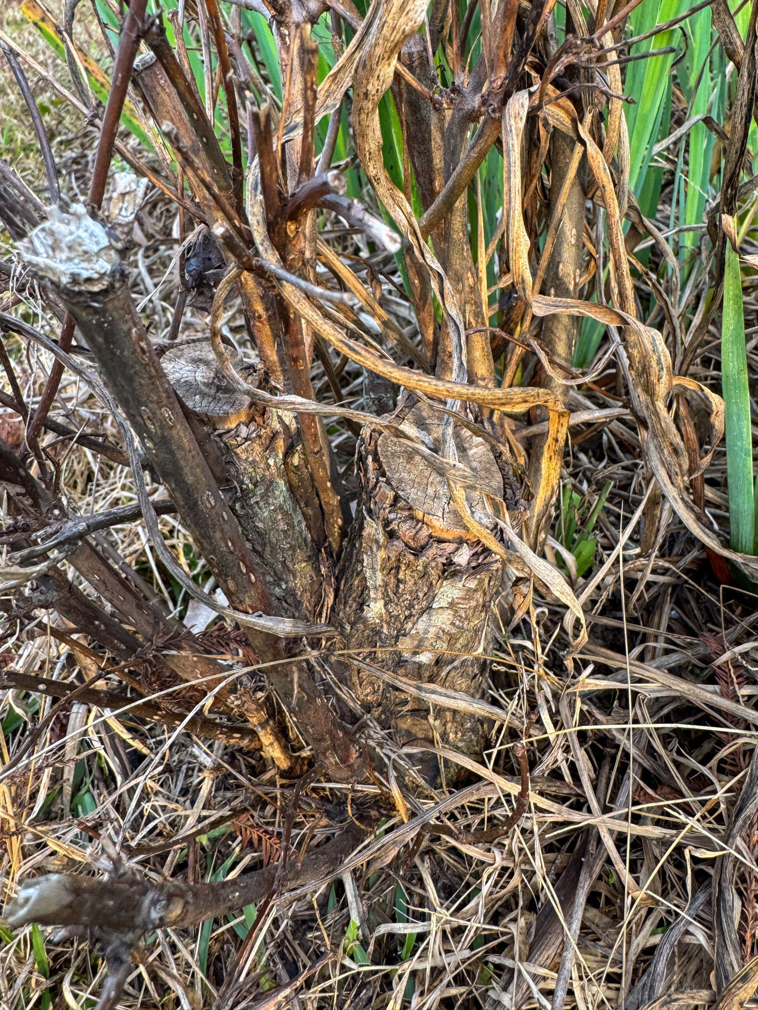 A small, struggling Buttonbush 1 with a little bit of new growth and its cut main stems. It's been knocked down, but it's not out yet.